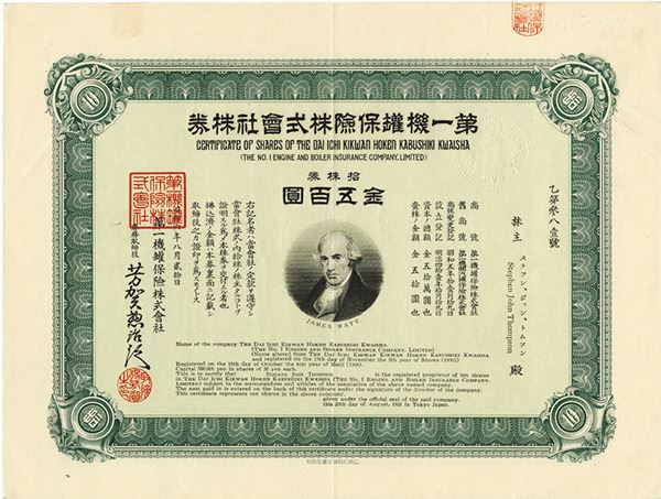 Japan. 10 Shares Issued and Uncancelled Stock Certificate. Company name translates to The No.1 Engine and Boiler Insurance Co., LTD. Black print with a green border and a light green under print. Portrait of James Watt, Scottish inventor, at center of certificate. James Watt helped to improve on the steam engine, and the unit of power, the watt, is named after him. XF condition, certificate is in English and Japanese. Scarce Japanese and English text on Japanese Stock Certificate. (John E.Herzog Collection).