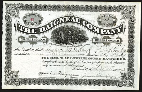 New Hampshire, 10 Shares, I/U stock, wood choppers in middle, Fine condition, scarce New Hampshire certificate.
