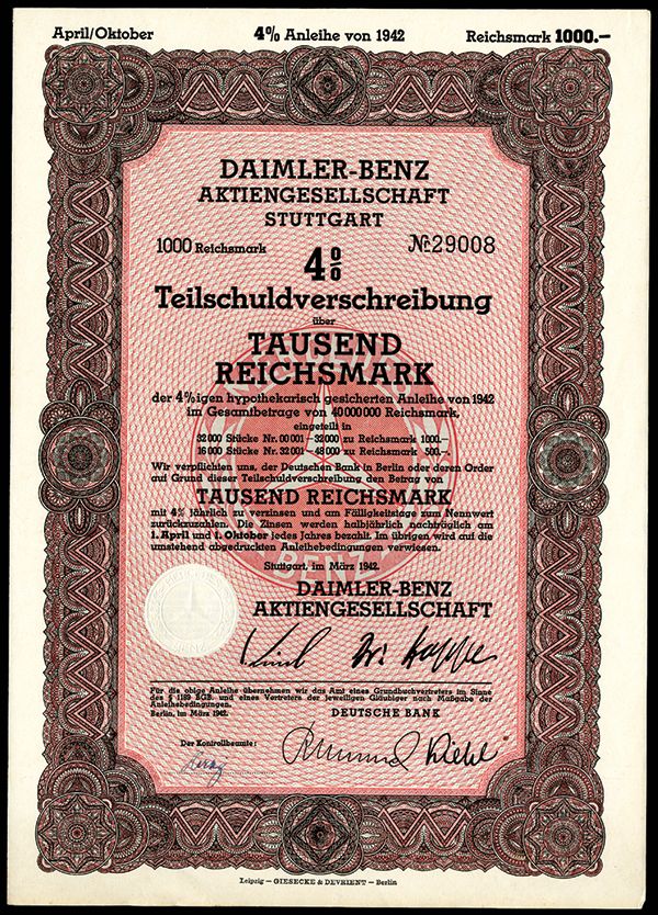 Daimler -Benz Aktiengesellschaft, Bond. Germany, 1942, Bond 1,000 Reichmarks, Mercedes Benz under the Supervision of the Third Reich, XF, I/U.