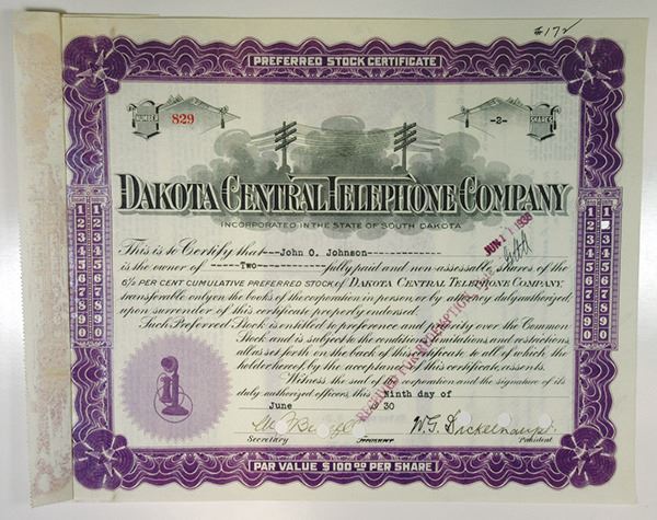 South Dakota. 2 Shares 6 1/2% Cumulative Preferred Stock Issued and Cancelled Certificate, Black print on bright purple border, Telephone wires across top of certificate, POC's at bottom, VF-XF condition.