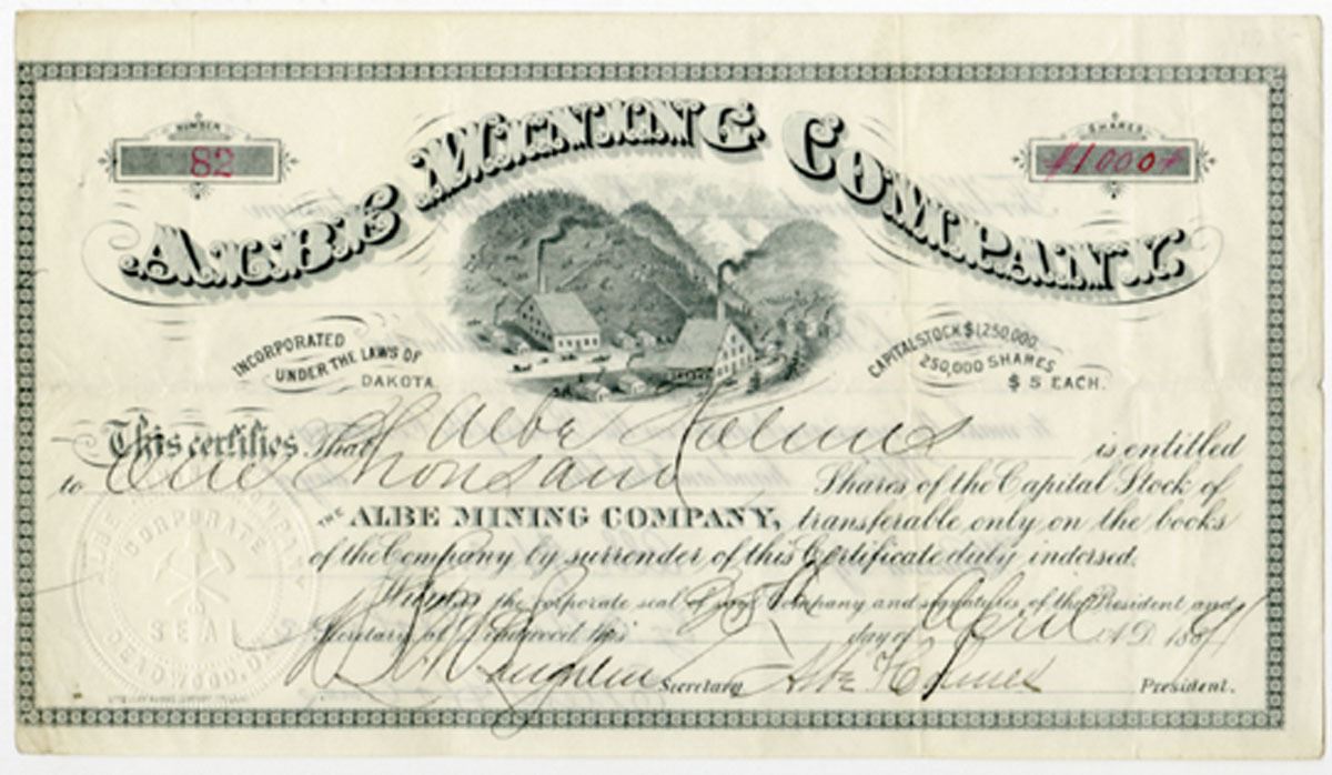Deadwood, Dakota Territory, 1891. 1,000 Shares I/U Capital Stock Certificate S/N 82, Black text with black border, no undertint, Scene at top of a bustling mining village. VF condition with staple holes at top left margin and slight toning along fold lines. This stock certificate was signed by Albe Holmes as president, and issued to himself, Rare.