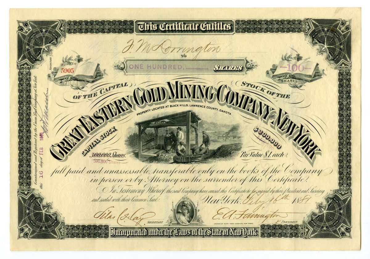 Dakota Territory (Incorporated in New York), 1881. 100 Shares Issued and Uncancelled Capital Stock Certificate, Black print on black border, Men at top of mine at center of certificate, Fine-VF condition with minor pin holes and toning at edges, ABNC.