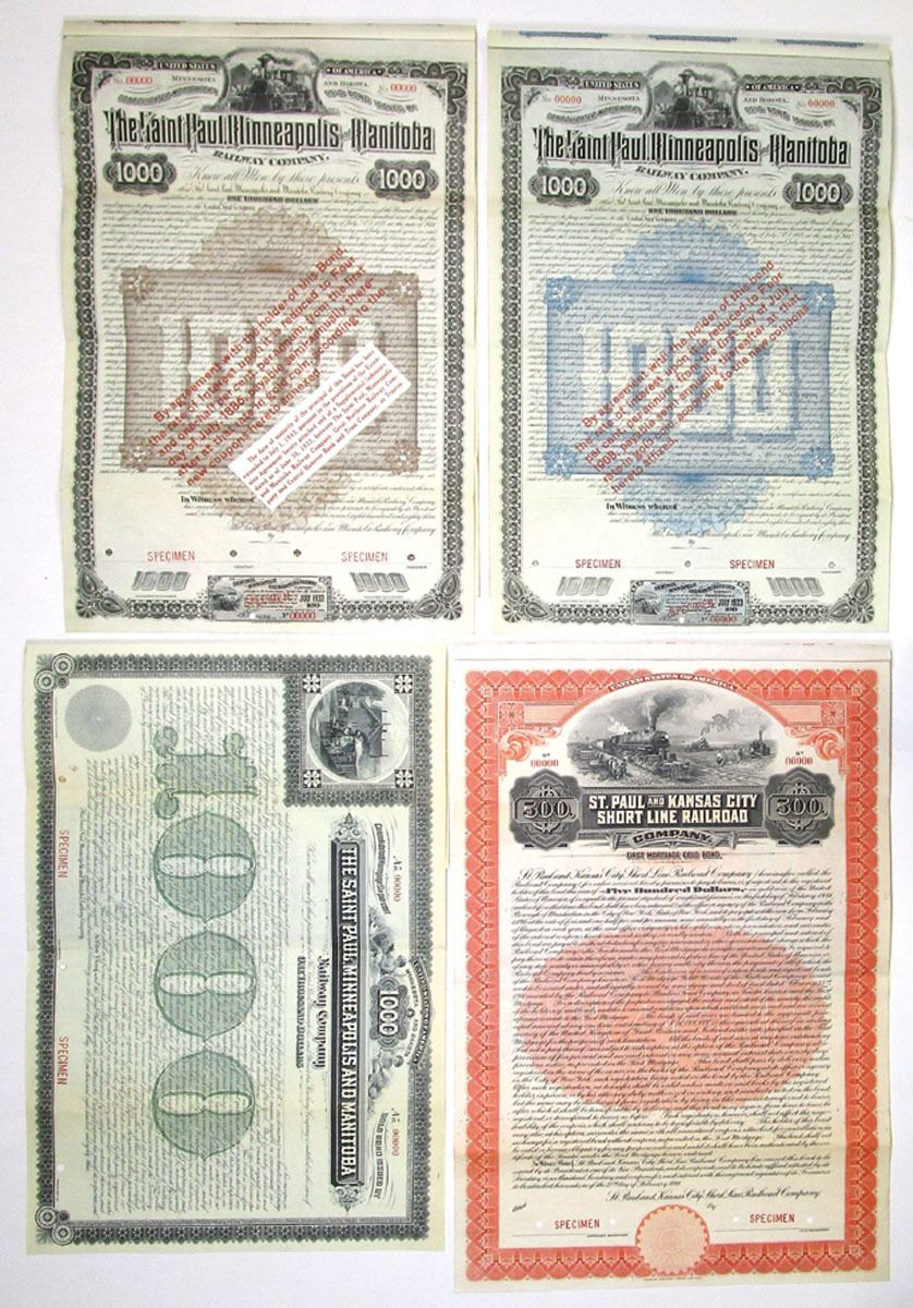 Minnesota & Dakota, 1883 to 1911. Lot of 4 Specimen Bonds, Includes: 1883, Saint Paul, Minneapolis and Manitoba Railway Co., $1000 Coupon Bond (2) and Registered Bond; 1911, St. Paul and Kansas City Short Line Railroad Co., $500 Coupon Bond. All have Specimen overprints, POCs, are in XF to AU condition, and printed by ABNC. (4). Sold "AS IS" no returns accepted.