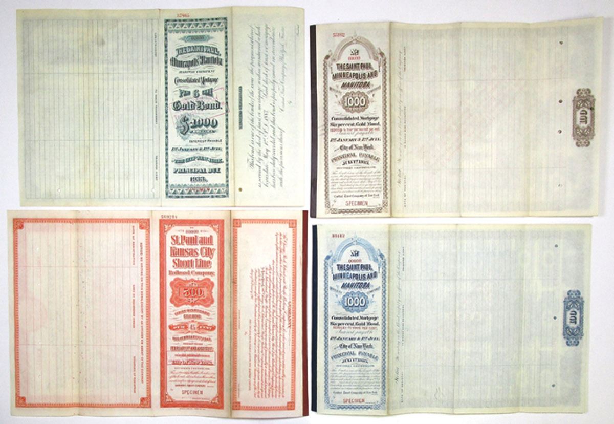 Minnesota & Dakota, 1883 to 1911. Lot of 4 Specimen Bonds, Includes: 1883, Saint Paul, Minneapolis and Manitoba Railway Co., $1000 Coupon Bond (2) and Registered Bond; 1911, St. Paul and Kansas City Short Line Railroad Co., $500 Coupon Bond. All have Specimen overprints, POCs, are in XF to AU condition, and printed by ABNC. (4). Sold "AS IS" no returns accepted.