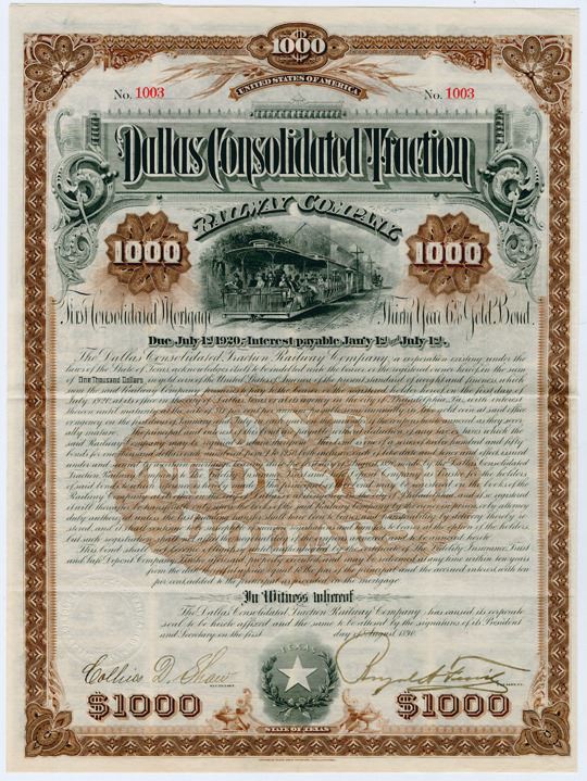Texas, 1890, $1000, 6% Thirty Year 1st Consolidated Mortgage Gold Coupon Bond, I/U Bond, #1003, Black on brown border and underprint, Electric trolley moving down city road top center with horse and buggy on right, VF-XF condition, ABNC.