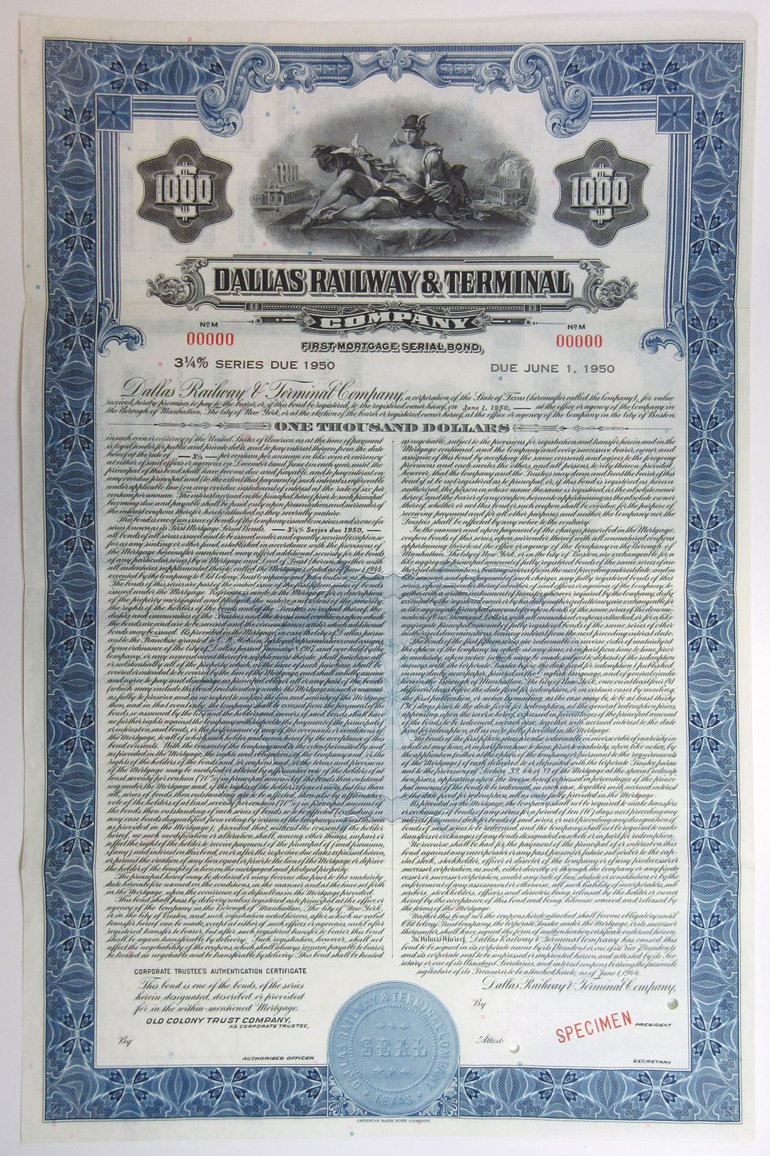 Texas, 1944 Specimen $1000 3 1/4% Coupon Bond VF ABN, Dallas Railway & Terminal Company was a privately run transit company that existed between 1926 to 1956.