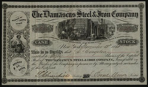 New York, 1860, I/U Stock, #66, 50 Shares, iron mill vignette, VF condition, Snyder, Black & Sturn.