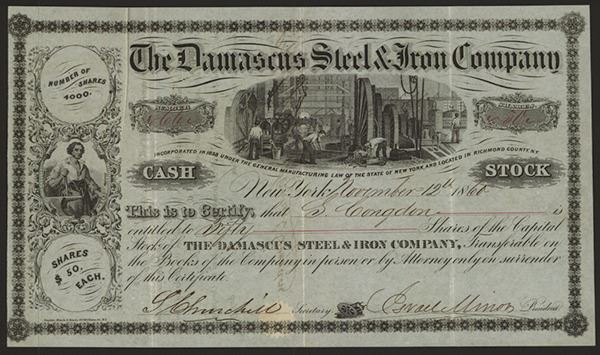 New York, 1860, I/U Stock, #66, 50 Shares, iron mill vignette, VF condition, Snyder, Black & Stern.