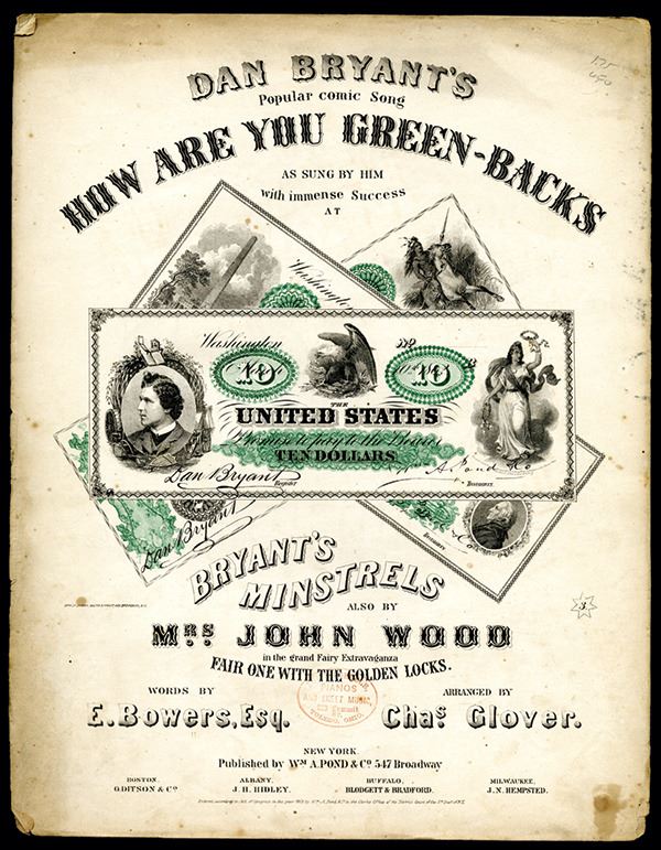 New York, 1863, 10.75 x 14 inches, 3 different overlapped banknotes on front middle in black and green with a $10 in middle, Lith. By Sarony, Major & Knapp, NY, looks similar to scrip notes and college currency from that time. 5 pages complete, splitting at folds, toning, but still very attractive and historic.