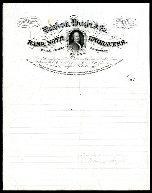 New York, 185x, 8.5 x 10.75 inches, Ornate title with Franklin portrait in middle, small text listing company products and services, VF condition, Rare security printer letter head. DW&C. (ex- Stacks “The 52 Collection” June 2010, Lot #5913).