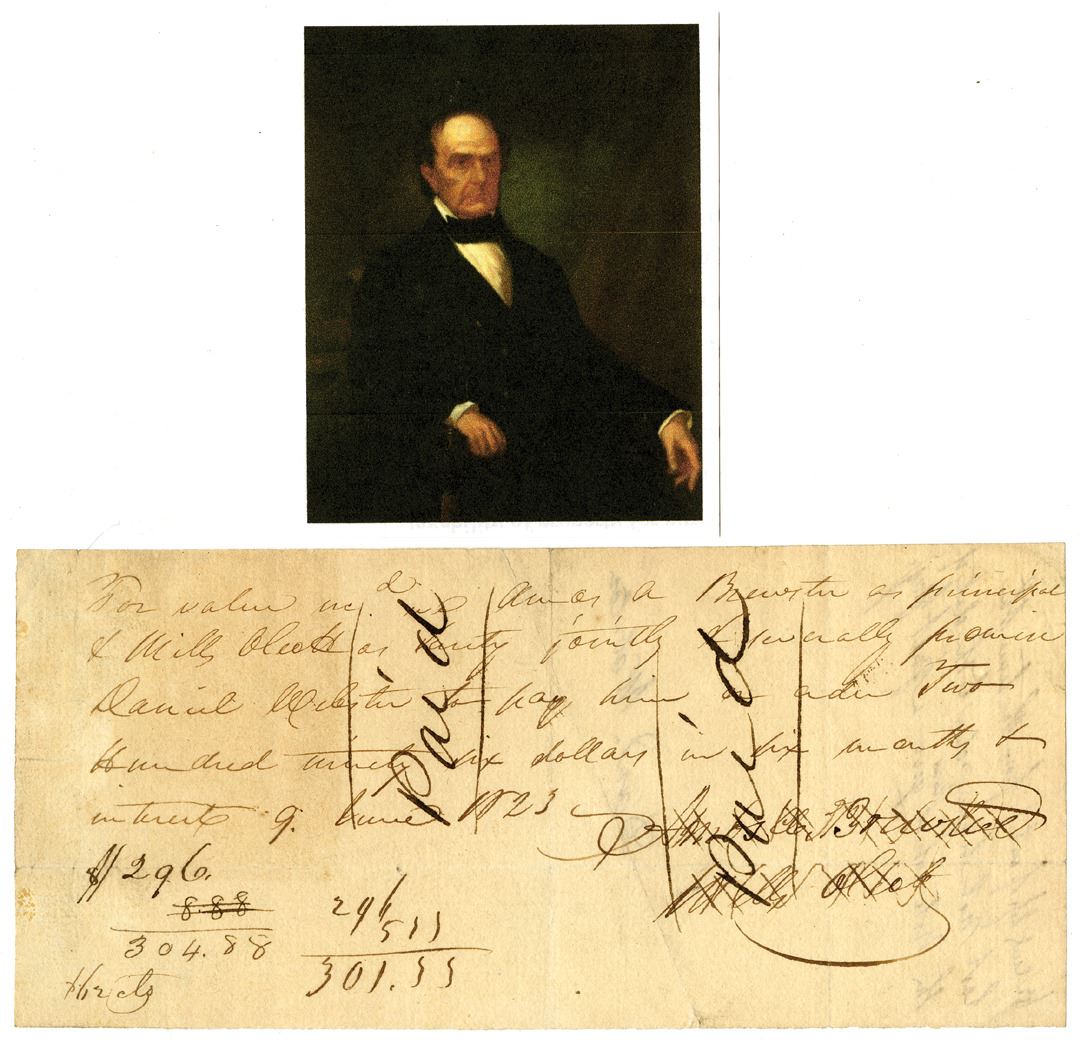 Handwritten promissory note, Issued and cancelled, which states Daniel Webster was to pay $296 in six months time, with interest. Paid written in ink across note, also with crossed-out signatures. Daniel Webster's signature is on back with handwritten details regarding payment and interest. Fine-VF condition. Daniel Webster (January 18, 1782 - October 24, 1852) was an American lawyer and statesman who represented New Hampshire and Massachusetts in the U.S. Congress and served as the U.S. Secretary of State under Presidents William Henry Harrison, John Tyler, and Millard Fillmore. As one of the most prominent American lawyers of the 19th century, he argued over 200 cases before the U.S. Supreme Court between 1814 and his death in 1852. During his life, he was a member of the Federalist Party, the National Republican Party, and the Whig Party. Webster is widely regarded as an important and talented attorney, orator, and politician, but historians and observers have offered mixed opinions on his moral qualities and ability as a national leader. (From the Collection of John E. Herzog)