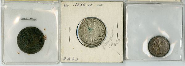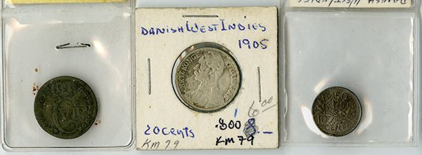 Danish West Indies, Lot of 3 coins. Includes 12 Skilling, 1767, KM-12, Fine; 20 Cents (1 Franc), 1905, KM-79, Fine to About VF; and 10 Cents (50 Bit), 1905, KM-78, Choice XF with rim dent. (3)