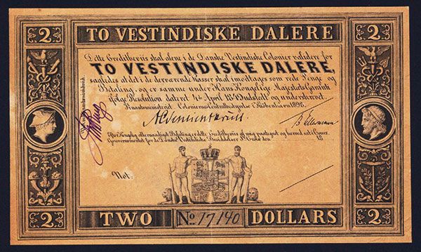 Danish West Indies, 18xx (ca.1898), $2, P-8b, 3 signatures, Black on light orange-brown paper, Mercury and Zeus portraits on left and right, arms in middle, back with numeral 2, S/N 17140, Choice XF, Remainder Banknote.