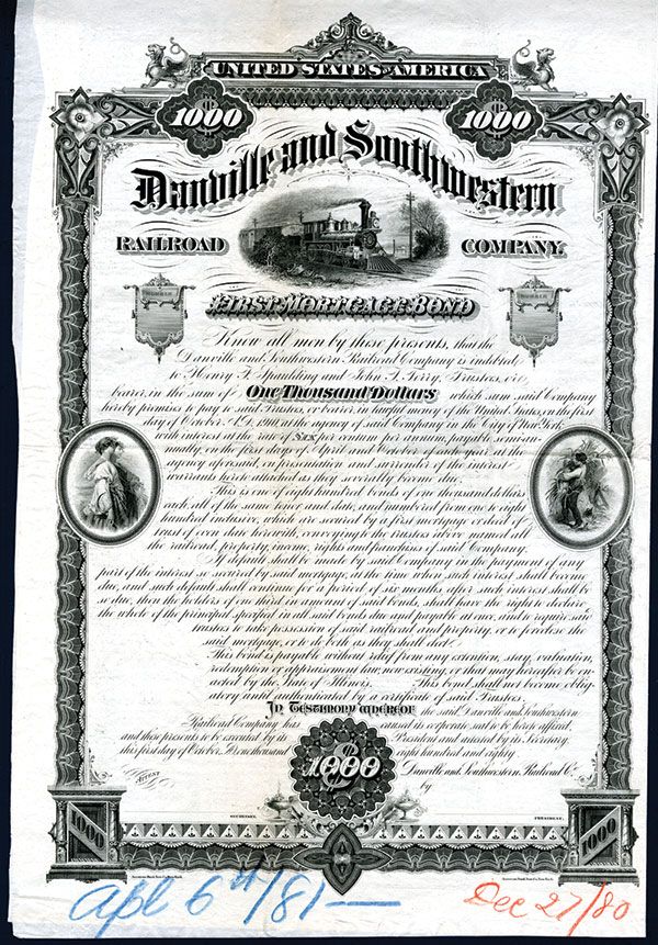 1880. $1000 6% Bond Proof with archival notations on the bottom. Moving locomotive top center with well known “Reaper vignette” on the left and man with wheat sheaf on the right. VF condition. ABNC. Lot includes instruction booklet from ABNC on bond details and a booklet with the bond “covenant” details to be included on front of bond. Only listed as proof in Cox with no more then 2 or 3 examples known.