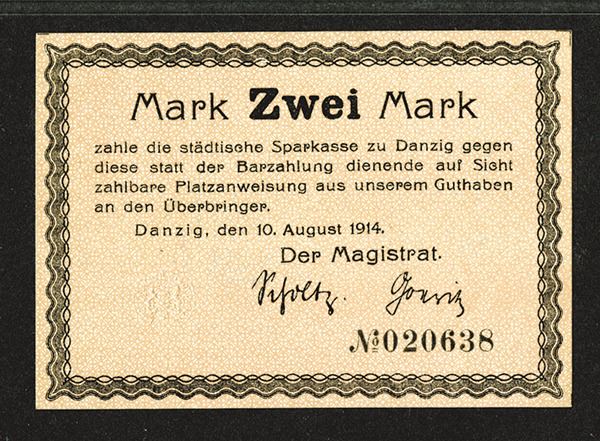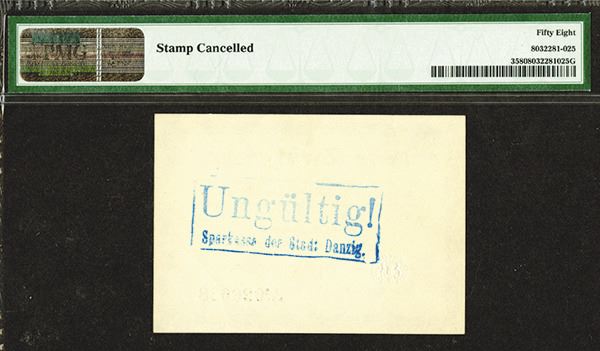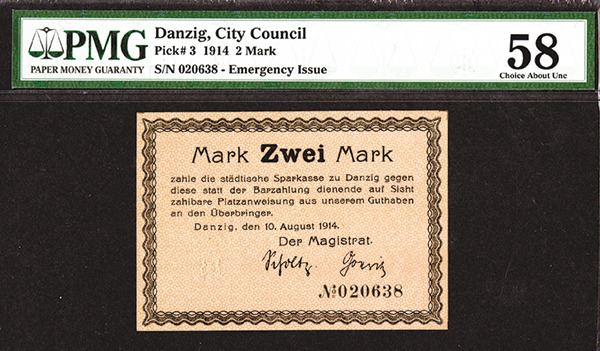 Danzig, 10 August, 1914, P-3, Issued banknote, Black on pink underprint, back with blue overprint "Ungultig….Danzig", PMG graded Choice About Uncirculated 58.