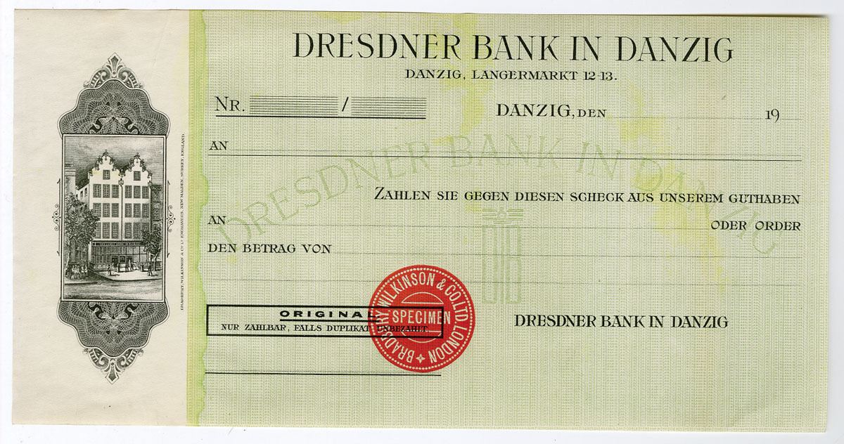 Danzig & Germany, ND (1920-30s). Specimen Check with Black printing on green underprint, Bank building at left, Red Specimen stamp at center, XF to AU condition with light green stains, BWC.