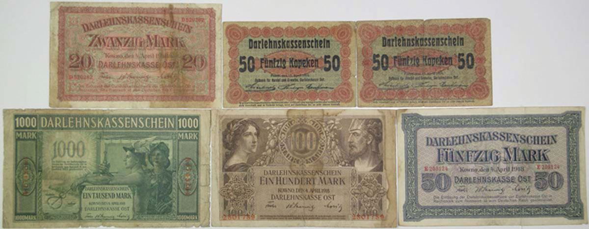 Germany. Lot of 6 Issued Banknotes, Includes: 50 Kopeken, 20 Mark, 50 Mark, 100 Mark, and 1000 Mark notes, all issued of for use in Kowno (Lithuania today). P-R121c; R121d; R131; R132; R133; R134b. VG to Very Fine. Sold "As is" no returns accepted for group lots. (6)