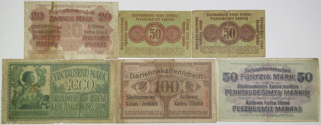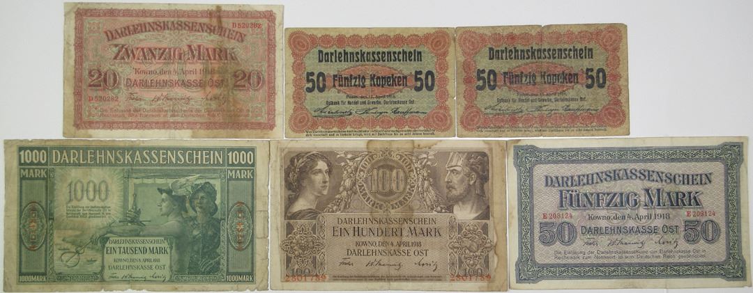 Germany. Lot includes a group of 50 Kopeken, 20 Mark, 50 Mark, 100 Mark, and 1000 Mark notes, all issued of for use in Kowno (Lithuania today). P-R121c; R121d; R131; R132; R133; R134b. VG to Fine. Sold "As is" no returns accepted for group lots. (6)