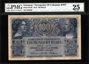 Posen (Poznan), 1916, 100 Rubel, P-R126, Issued banknote, Blue. Woman at left and man wearing helmet on right, Occupation of Lithuania WWI Issue. PMG graded "25" Very Fine with small margin split. Attractive example of this scarce note.
