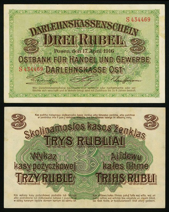 Posen. 1916. 3 Rubel, P-R123b, Issued banknote, brown on green and lilac underprint, back the same colors. This XF+ note is one light fold away from AU to Uncirculated condition. Scarce note in high grade.