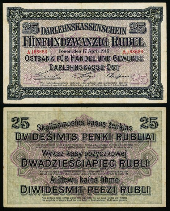 Germany, 1916. 25 Rubel, P-R125, Issued banknote, dark blue on lilac underprint. VF to VF+ condition with evidence of previous mounting on all 4 corners that impressed the paper where it was mounted in book, otherwise the note would have been close to XF condition. Scarce note.