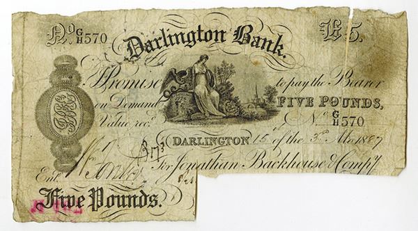 Darlington, England, £5, Issued, Allegorical woman in middle, S/N G/H570, Fine to Choice Fine with signature cut out on bottom right to cancel note.