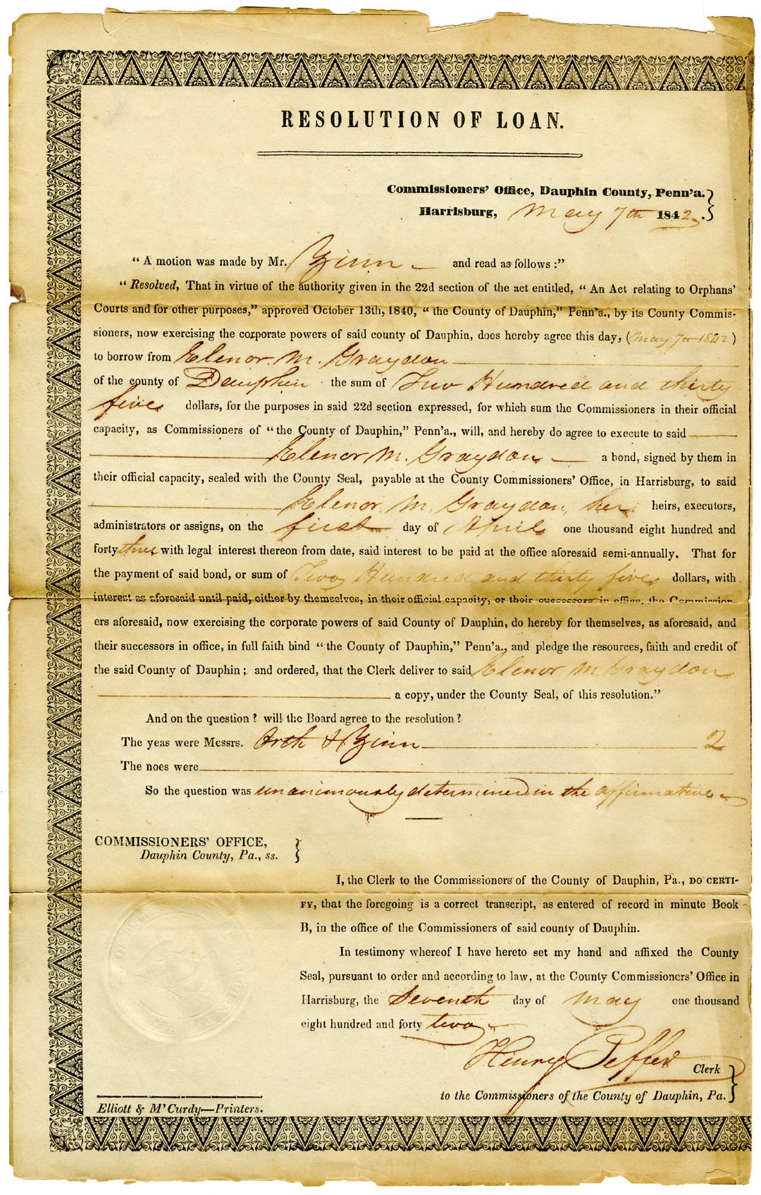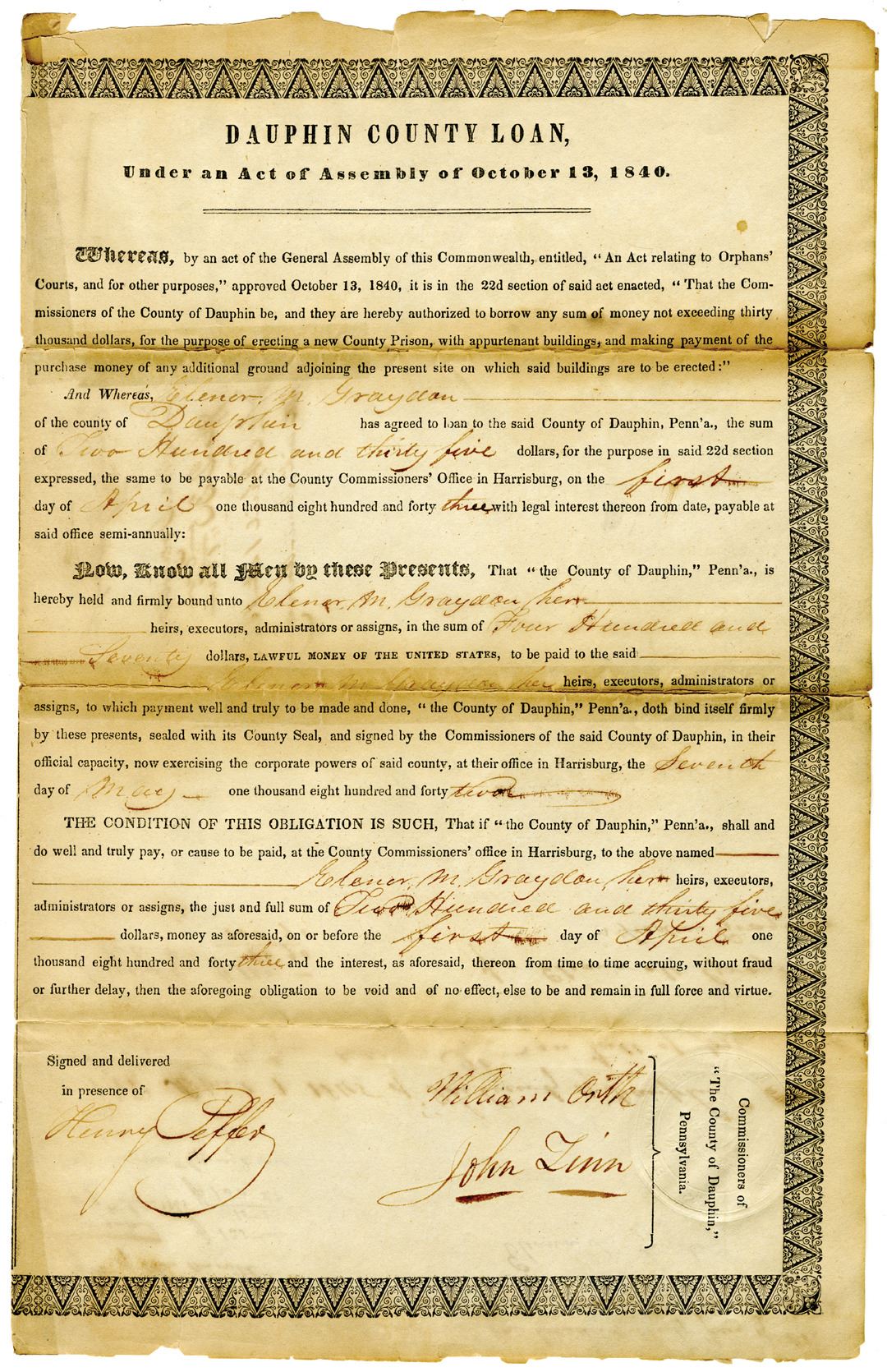 Pennsylvania, 1843. $235 Issued Loan and Resolution Document Pair, Black text with black border, Dark brown handwriting. Fine condition with toning from repaired splits and damage to margins. An Act of Assembly "relating to Orphan's Courts" allowed the Commissioners of Dauphin County, Pennsylvania, to borrow money for the establishment of a new County Prison. The Dauphin County Prison began construction in 1840 and was completed in 1841. It was later demolished in 1957.