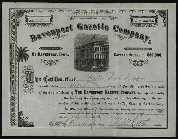 Davenport, Iowa, 1882. 50 Shares I/C Capital Stock Certificate #1, Black text with black border, Gazette building depicted at center. Fine condition. First Stock Certificate issued by this company. In 1841, the Davenport Gazette weekly newspaper was established by the Sanders & Davis Company. On October 16, 1854, The Davenport Gazette became DavenportÕs first daily newspaper.
