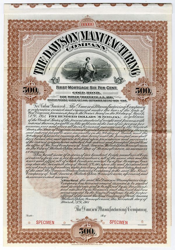 West Virginia. $500, Specimen 1st Mortgage 6% Gold Coupon Bond. Black vignette and text on brown border, allegorical woman in middle with small train passing on her right under curved title. Specimen overprints, POC's, ABNC. In 1901, the first known car to be made in Virginia was the Dawson Car, named for George Dawson, an Ohio machinist. Dawson set out from Cincinnati for Basic City (now Waynesboro), Virginia, via the Chesapeake and Ohio Railroad (C&O), in 1899. There, at the crossroads of the C&O and the Shenandoah Valley (later the Norfolk & Western) Railroad, he established a machine shop known as Dawson Manufacturing Company. While the railroads likely kept him in business, Dawson also decided to try his hand at building a steam-powered car. The Dawson Steam Auto-Mobile was a 2-cylinder runabout with single chain drive and tiller steering. The driver and one or two passengers could sit atop the bench seat; the engine was located beneath it. The car rode on wire-spoked wheels with white rubber tires. Its top speed was said to be somewhere between 25 and 30 mph, and its side brass lamps ensured that a driver could continue driving into the evening hours. After the first model was on the road and a proven success, Dawson tried advertising the car in an automotive trade journal Ñ but there were no takers. Because he wanted to continue building a second car, eventually he sold the first to Luther Gaw (auto mechanic) and John Clark (barber) of Waynesboro, Virginia. While Dawson continued to try to get backing, Basic City's businessmen and bankers were not inclined to support the start-up car manufacturer. Discouraged and leaving his second incomplete car unsold, Dawson closed his business and returned to Cincinnati. Only 2 examples found in the ABN Archives.