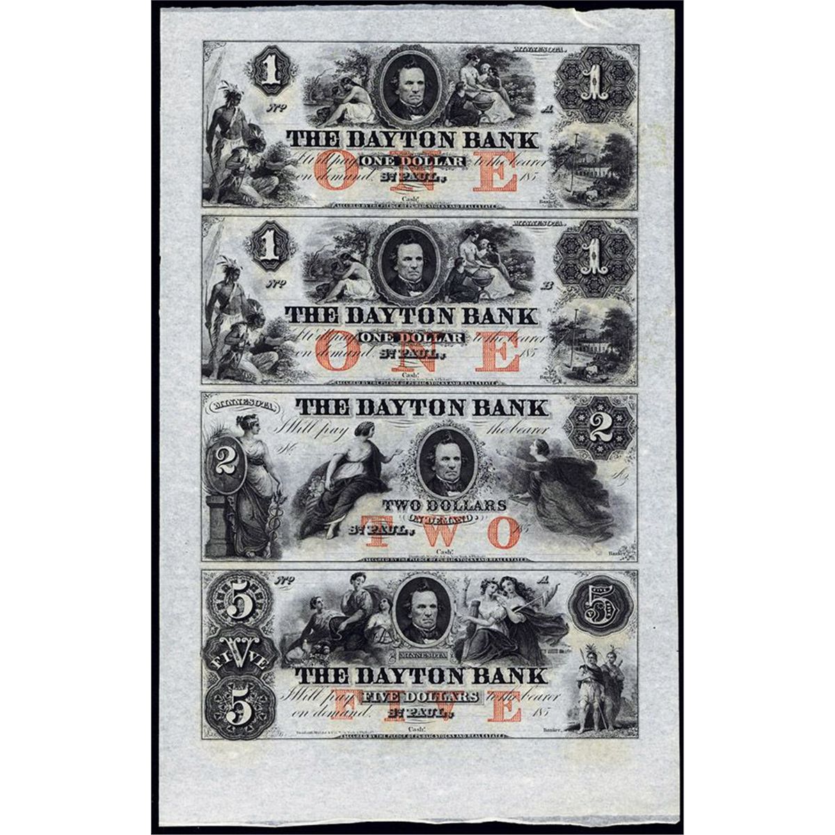 St.Paul, Minnesota. 185x, $1-1-2-5-, MN-135-X1 (G2a-G2a-G4a-G6a), Uncut sheet of 4 notes, All unissued, all with Portrait of Lyman Dalton in center flanked by various allegorical images, All with red protectors, blank backs. Both of the $1 notes appear AU+ to Unc., the $2 and $5 notes have a very light diagonal crease, keeping them from Uncirculated. Scarce and very attractive Minnesota Uncut Sheet. DWC.