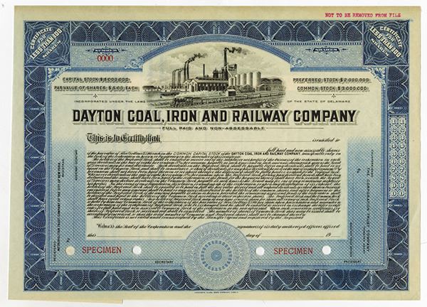Delaware. Specimen stock certificate, <100 Shs, blue border, with train speeding by large factory or steel mill. Red "Specimen" overprints, POC's, and "Not to be removed from file" overprints. XF condition. Rare and attractive. SBNC.