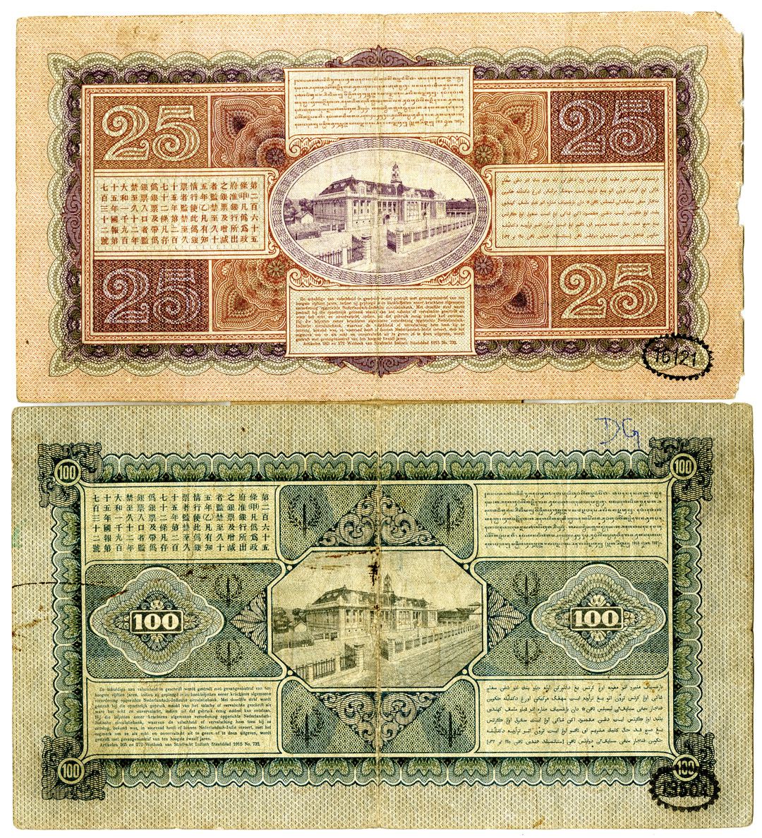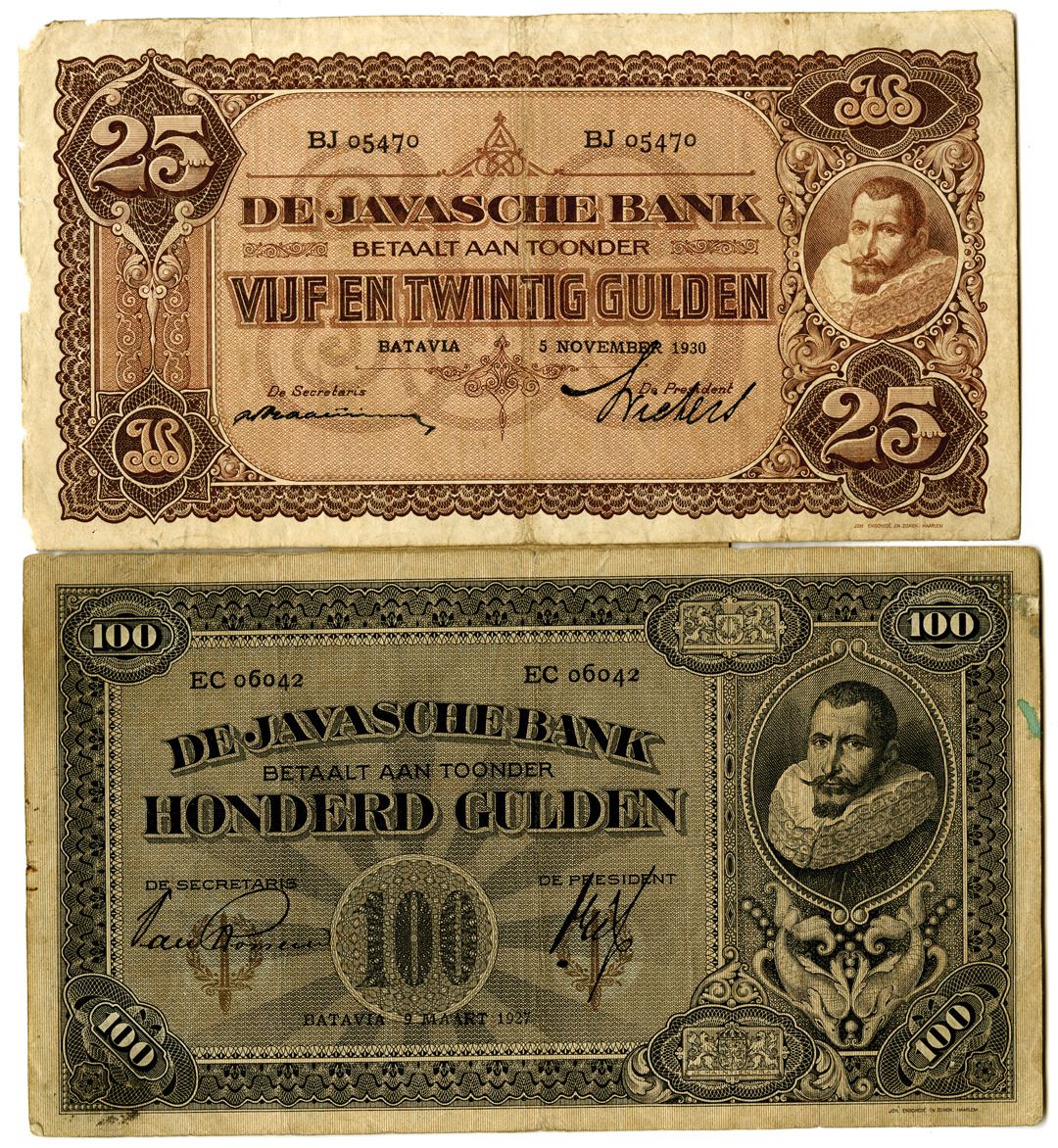 Netherlands Indies.... Lot of 2 issued banknotes includes 25 Gulden, 1925-1931 (1930), P-71c, brown with portrait of Jan Pieterzoon Coen with ruffled collar left right, JEX, Fine condition with damage around left edges and vertical folds; and 100 Gulden, 1925-1930 (1927), P-73b, black with portrait of Jan Pieterzoon Coen with ruffled collar left right, JEX, Fine to VF condition with wear around vertical folds. (2)