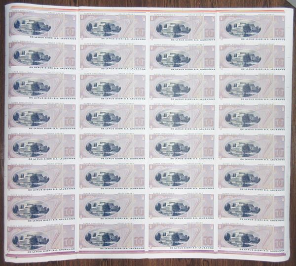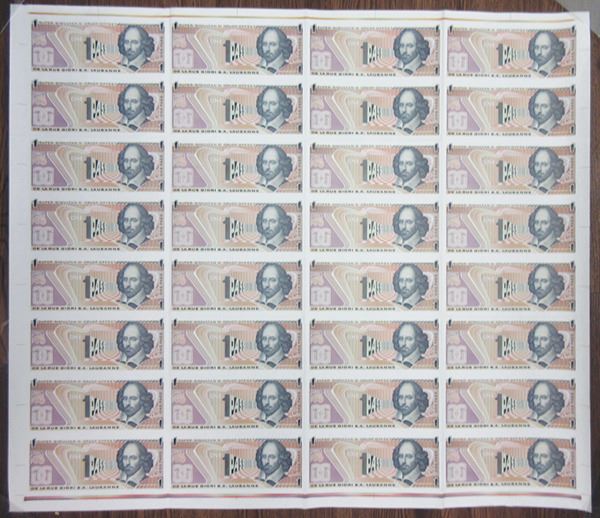 Great Britain. A large uncut sheet of 32 advertising notes with portrait of Shakespeare at right on face, and a building on back. "One Pass" denomination. Multicolor undertint on both sides. Designed and engraved by De La Rue Giori S.A. Lausanne (Switzerland). AU to UNC.