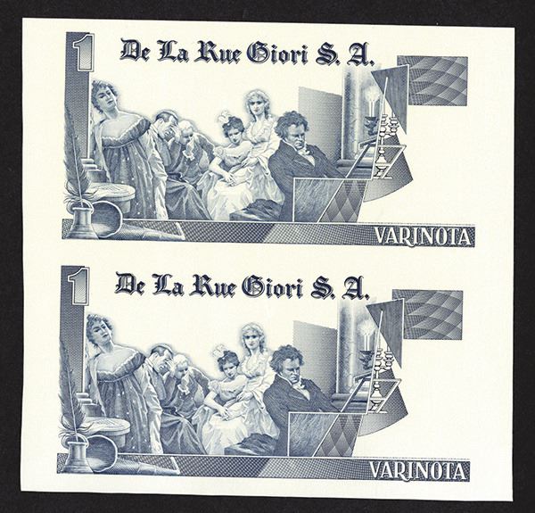 Italy. Beethoven playing at piano. One-color design used as a multi-color impression on other notes. Includes micro printing ONE PASS line at right side. Vertical pair. Without watermark. On DuraNote polymer substrate. About Uncirculated.