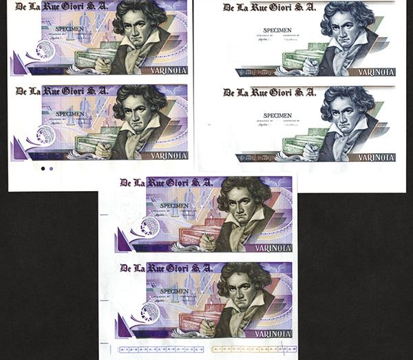 Italy. Beethoven portrait at right. One pair without underprint and without security thread in paper. Two pair with underprint and security thread in paper, but with different bottom margin notations. All with Pegasus, 1, and DLRG blind embossing at left end. No serial #. Uniface as made. Extremely fine. 3 pieces.