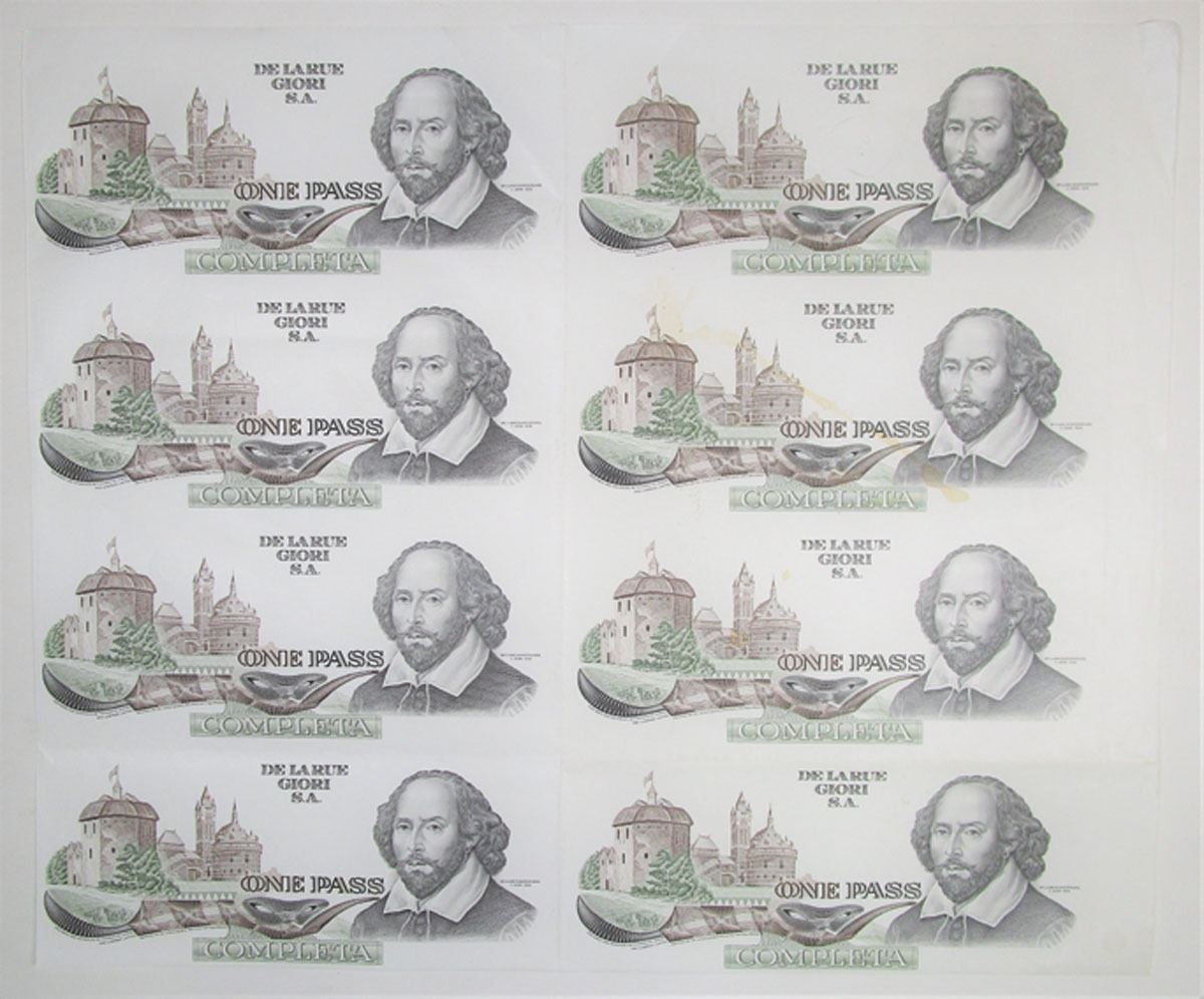 Great Britain, ca.1970-80's. Large Sheet of 8, Uncut Uniface Progress Proof "One Pass" Notes from De La Rue Giori, Front is in black, brown and white on olive green undertint, featuring a portrait of William Shakespeare with an illustration of the Globe Theatre (as it was in Shakespeare's days) in the background. Notes range from VF to AU condition. Designed and engraved by Thomas de la Rue & Co. Ltd.