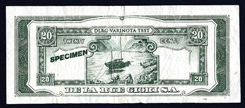 China and England, ND (ca.1970-80's), 20 cents denomination, Dark green on Tyvek Polymer type of paper, back of Central Bank of China, P-396, with sampans at anchor, an additional border with “DLRG - Varinota - Test” text on top and “De La Rue Giori S.A.” on bottom, same design and color printed on both sides, VF condition, Rare De La Rue Polymer test note. TDLR.