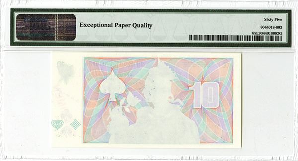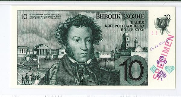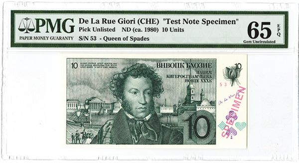 Specimen advertising note, "10 Units" denomination, featuring Russian writer Aleksandr Pushkin as subject. Cyrillic text (sample arrangement of letters without any meaning). Unfinished reverse. PMG graded Gem Uncirculated 65 EPQ.