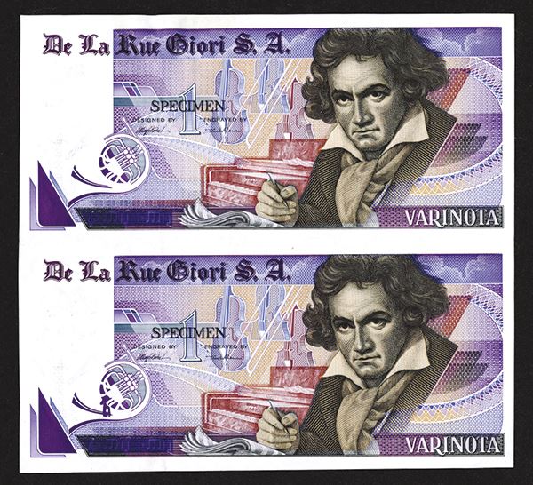 Great Britain. De La Rue Giori S.A. Specimen of Varinota. Beethoven portrait at right and in watermark at left. Back with Beethoven giving parlor concert. Uncut vertical pair, folded between notes; otherwise EF or better.