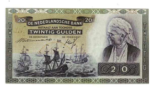 Netherlands, 1941, 20 Gulden, P-54 Replacement note, Sailing ships at left at left, woman at right, back with buildings, S/N HP102157. Choice to Gem Uncirculated.