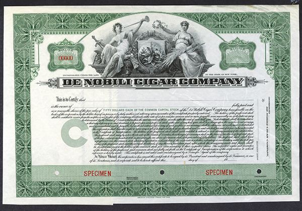 New York. Odd Shares, Common, Green frame, Seated allegorical man and woman flank tobacco plant, EF. Specimen overprint, POC's, VF. Scarce cigar related company. ABNC.