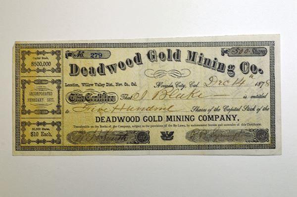 California. 500 Shares Stock Certificate. I/U. Assessment notations in ink on back. Very Fine +.