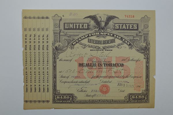 PA. Large format 1915 tax stamp for Dealer in Tobacco. $4.80. For a Chestnut St. store in Philadelphia. Fragile and toned paper. Fine.