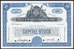 New York, ND (ca.1934). 100 Shares Capital Stock Specimen Certificate, Blue border with Allegorical couple flanking Decca logo of record album at top, Specimen overprints and POCs, XF-Uncirculated condition, HBNC.
