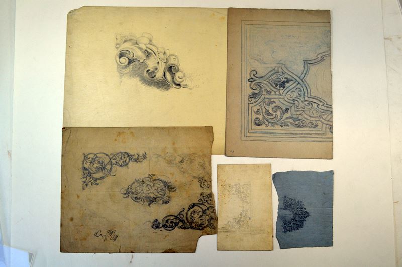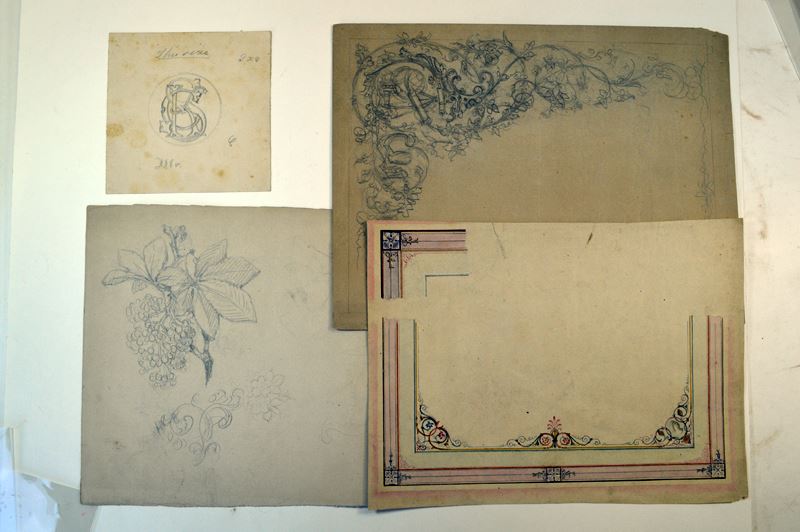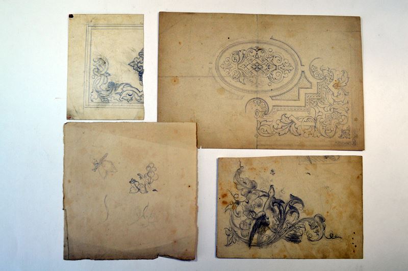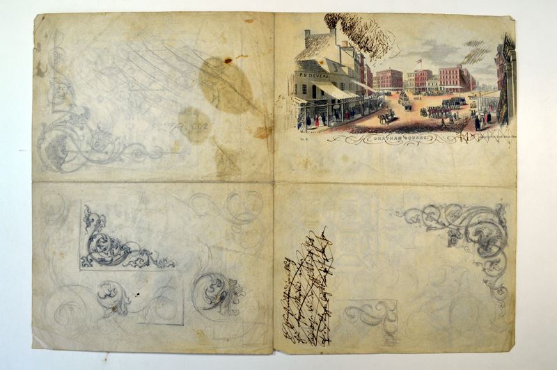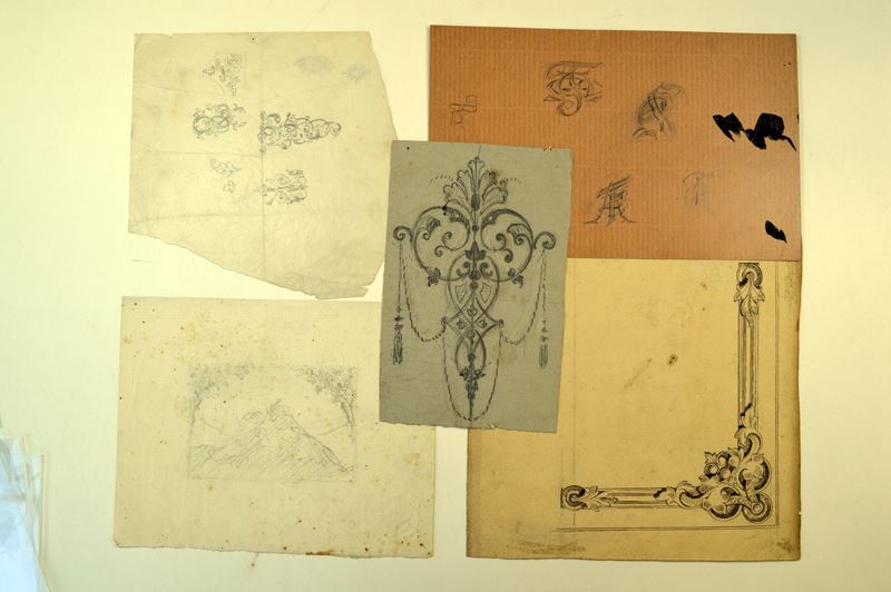Sketches in pencil of ornaments and borders filling a large folded letter sheet imprinted with a view of Chatham Square, NY. Four lines in German inked over. 14-1/4x10 inches. Quarter folded. Slight paper loss and separation at fold mentioned for accuracy. Additional drawings and sketches of flora, monograms, figures, frames, one in color. 19 pieces total. Variety of paper sizes and fragments.