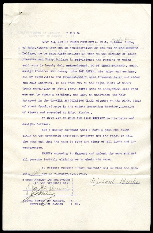 Alaska, 1912, Deed to land and interest in wood cut in Ruby, Alaska.