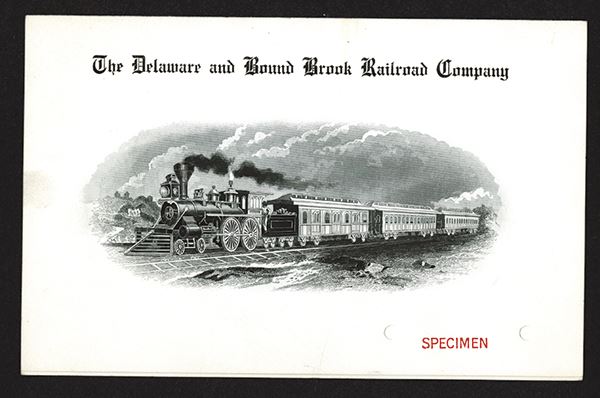 PA. Delaware and Bound Brook Railroad Co. Menu from a 1945 event at the Philadelphia Club. POC on cover, SPECIMEN printed, Litho. Slightly dirty on left end of cover. Inventory number on back.
