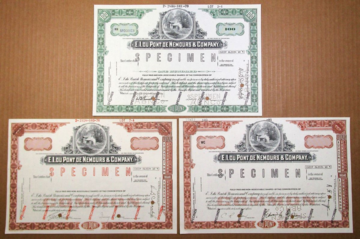 Delaware, 1976-81. Lot of 3 Specimen stock certificates, All have Specimen overprints and POCs and are in XF to AU condition. E. I. du Pont de Nemours and Company, commonly referred to as DuPont, is an American conglomerate that was founded in July 1802 as a gunpowder mill by French-American chemist and industrialist Éleuthère Irénée du Pont. (3). Sold "AS IS" no returns accepted.