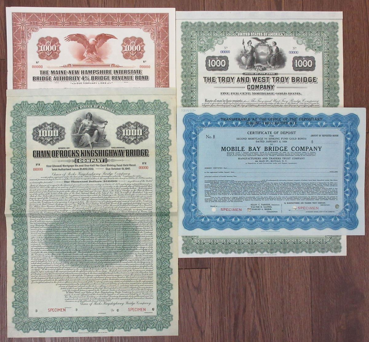 Delaware. 1914 to 1939, Lot of 4 Specimen Bonds, Includes: 1939, Maine-New Hampshire Interstate Bridge Authority; 1927, Delaware, Chain of Rocks Kingshighway Bridge; NY, 1914, The Troy and West Troy Bridge Co.; and, 1926, Mobile Bay Bridge Co. All are XF to AU condition. 4 Pieces.