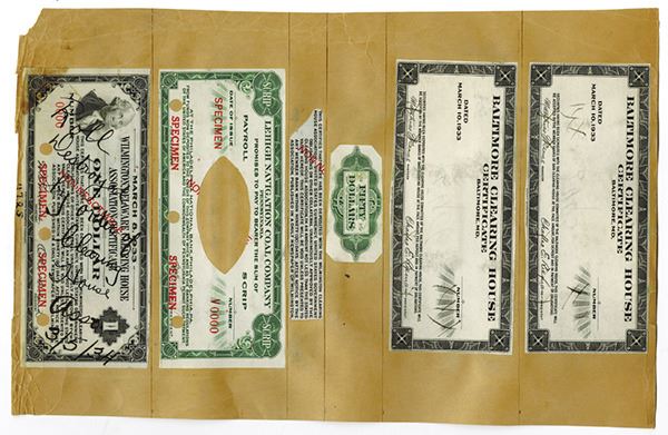 Baltimore, Maryland; Wilmington, Delaware; Philadelphia, Pennsylvania, 1933. Lot of 5 different depression scrip note proofs in various stages of printing. All are mounted on both sides of a manila sample page from Security BNC work book. Includes: 1,2). Baltimore Clearing House Certificate pair in black with borders, titles and small text, no vignette or denomination for both; 3). Lehigh Navigation Coal Co. Scrip note with central part of note cut out. Red "Specimen" overprints, no denominations; 4). Wilmington, Delaware Clearing House Association Certificate. $1. Specimen overprint. POC. Lower left corner has glue stains. Black. Washington on left, Written over note "Roll Destroy by Order of Clearing House Asso., 3/5/34"; 5). Lehigh Navigation Coal Co. Scrip note with central part of note and title cut out. Red "Specimen" overprints. There are additional denomination proofs on the pages and back proofs. Rare archival working proof sheet. VF to XF condition. Unique in archive and unique production department format.
